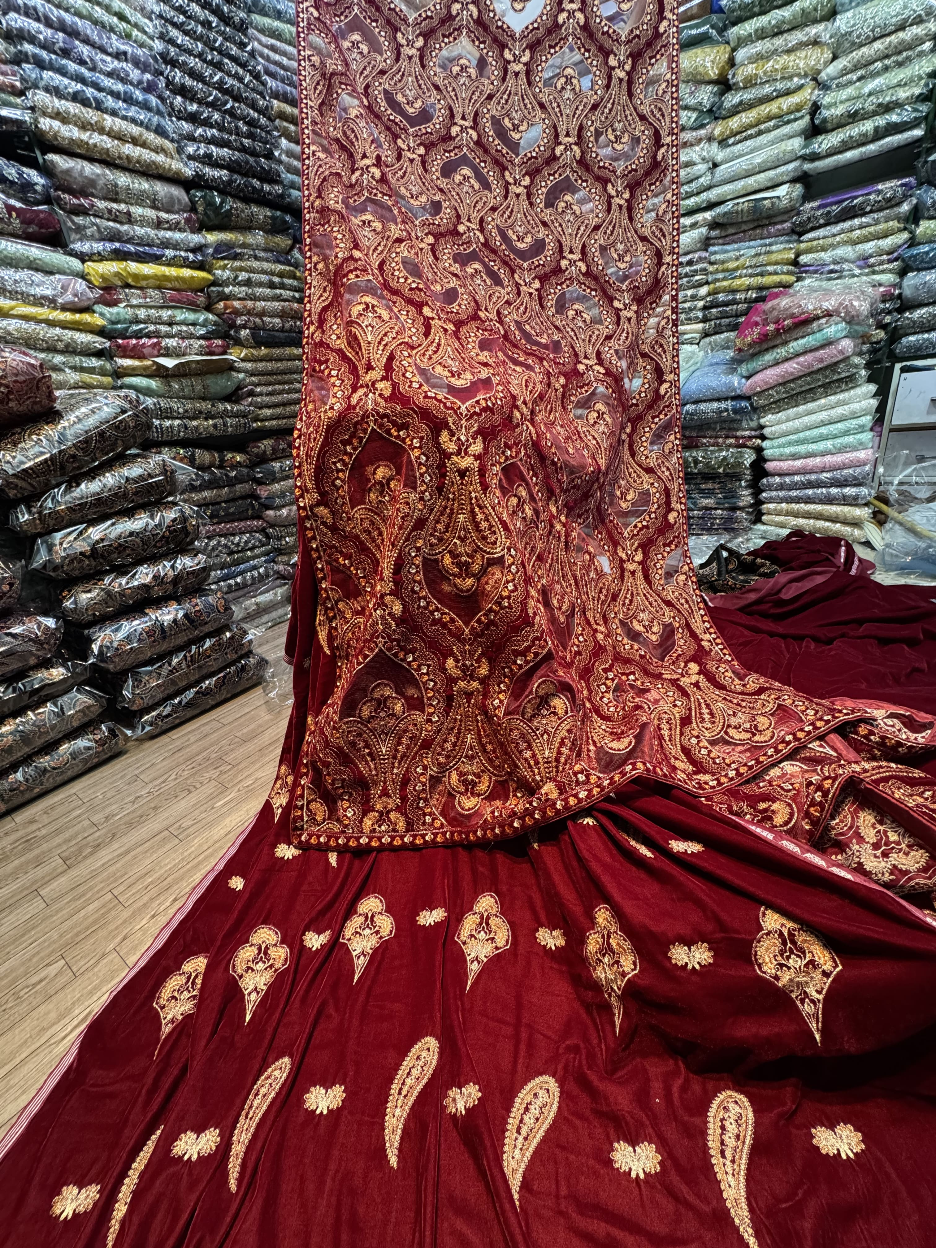 This unstitched three-piece set is crafted from pure micro velvet 9000 fabric, featuring a trendy cutwork dupatta measuring 2.5 yards. The shirt is 3 yards long, paired with 2 yards of generously sized trousers. Alternatively, you can style it with palazzo trousers for a modern look.